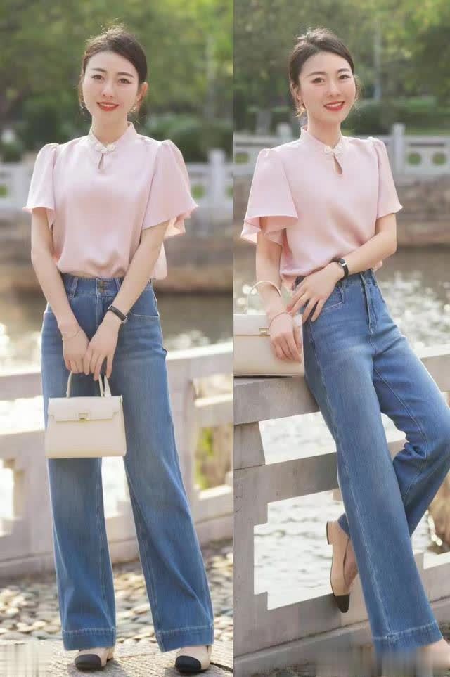 例如这位女士塑造的夏季穿搭中,其中粉色上衣与牛仔裤的搭配,不仅保持住了造型的清爽气氛,同时也是优雅感与帅气感同时融入到了穿搭中,看上去不仅日常也很时尚。