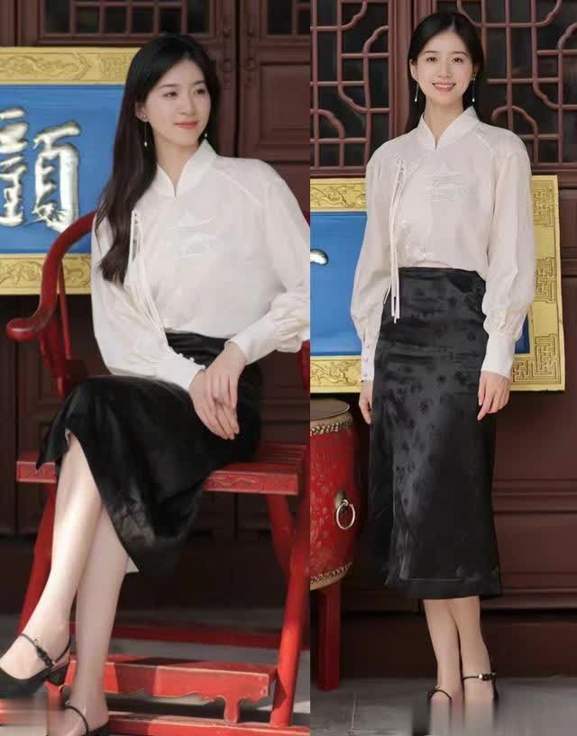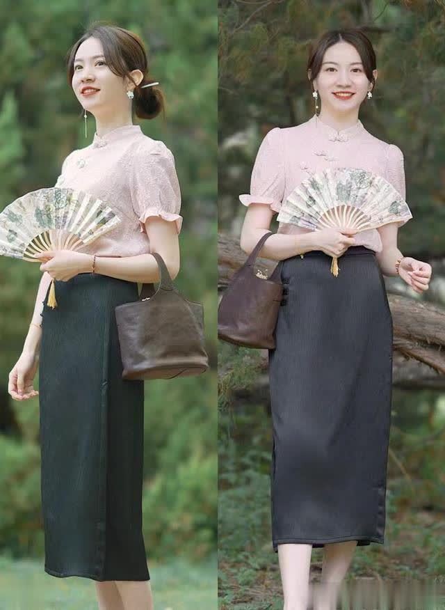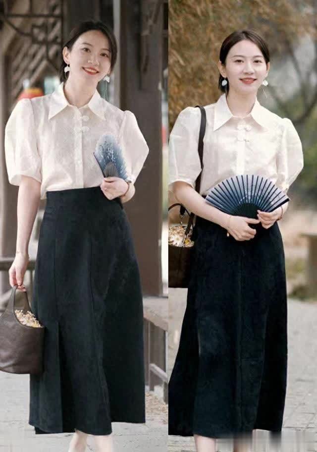 而在运用这种搭配方案时,利用白色新中式上衣配黑色半裙,使清爽感位于视觉重心,更好的来修饰个人状态。