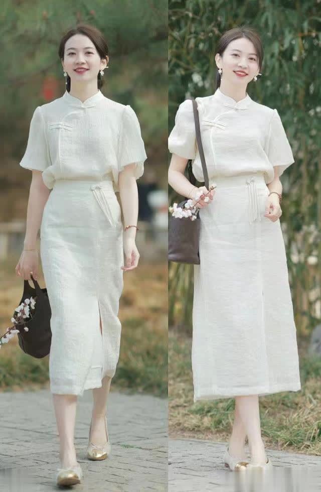 不论年纪多大,都可以应用这样一身白色系的新中式穿搭,毕竟白色就不存在任何的驾驭难度,同时也是大众比较推崇的色调。而选择下搭同色系的单鞋时,整体风格就可以衔接的更紧密,使极致的轻盈感围绕在造型中。